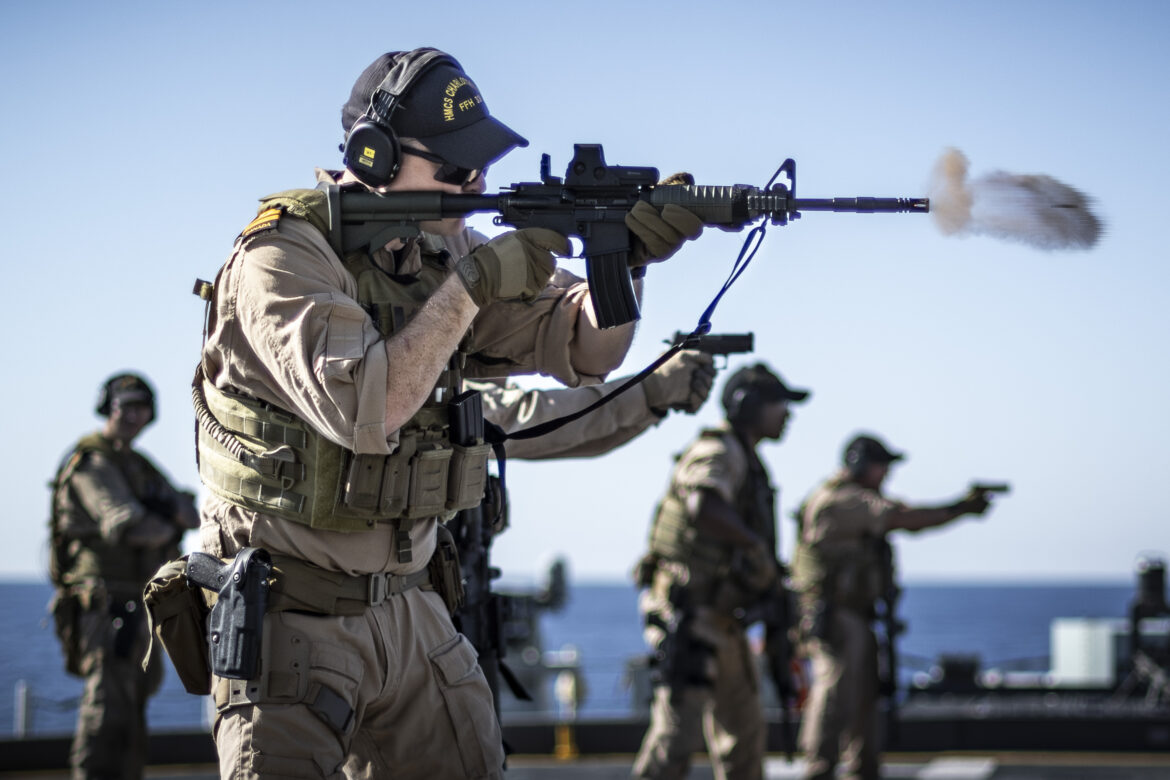 Members of HMCS Charlottetown’s Naval Boarding Party conduct a live fire range on the flight deck of the ship to maintain weapon proficiency as the ship conducts patrols in the Mediterranean Sea during Operation REASSURANCE on 05 October 2024.