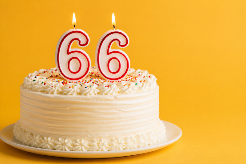 Birthday cake with white frosting and two candles forming the number 66 on top, against a yellow backdrop.